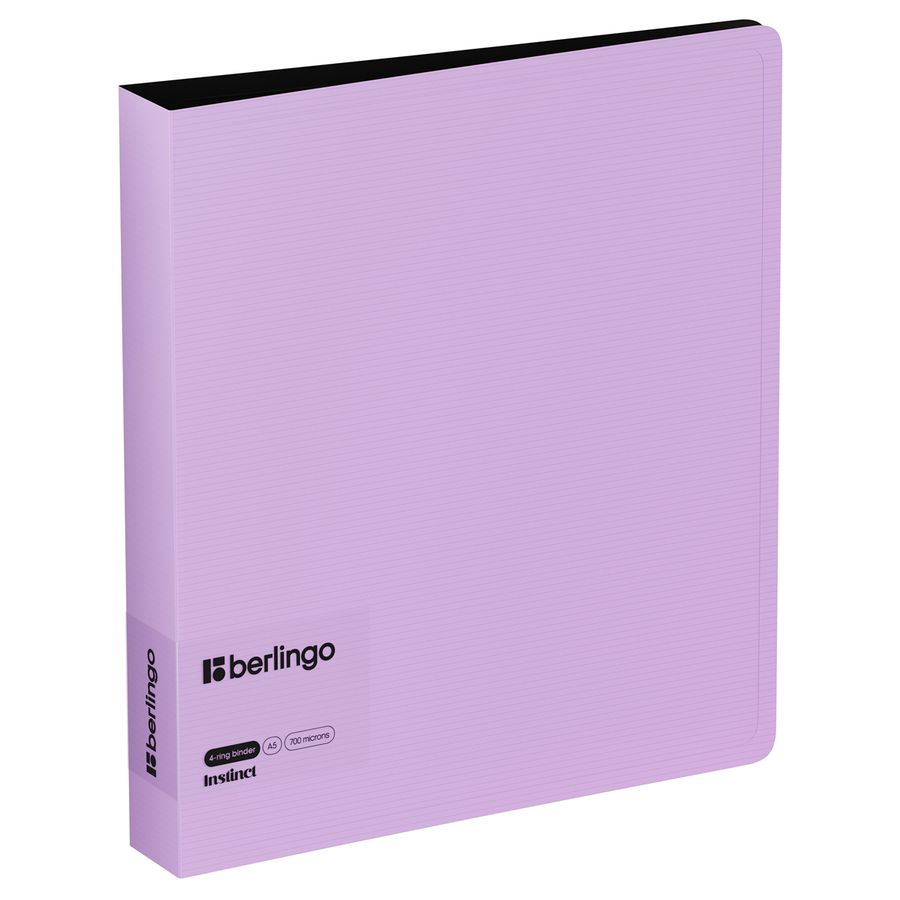 Папка на 4 D–кольцах Berlingo серии Instinct формата А5 – стильный аксессуар для офиса и учёбы. Лавандовый цвет внешней стороны в сочетании с фактурой «горизонтальные линии», чёрный цвет внутренней поверхности. Толщина обложки – 700 мкм. Ширина корешка составляет 35 мм. Стильные черные кольца и фурнитура. Специальная D–форма колец диаметром 30 мм помогает удобно и ровно хранить документы, которые могут быть выровнены по левому краю, благодаря боковой вертикальной стенке кольца. Вместимость папки – 200 листов. На внутренней стороне обложки папка оснащена плотным прозрачным карманом для удобного хранения мелочей: ручки, заметок, визиток, дисков, флешек и др. Размер папки составляет 225*200*35 мм. Упакована в индивидуальный прозрачный пакет по форме.• Вместимость, в листах: 200;• Формат: А5;• Цвет: лаванда/чёрный;• Ширина корешка: 35 мм.