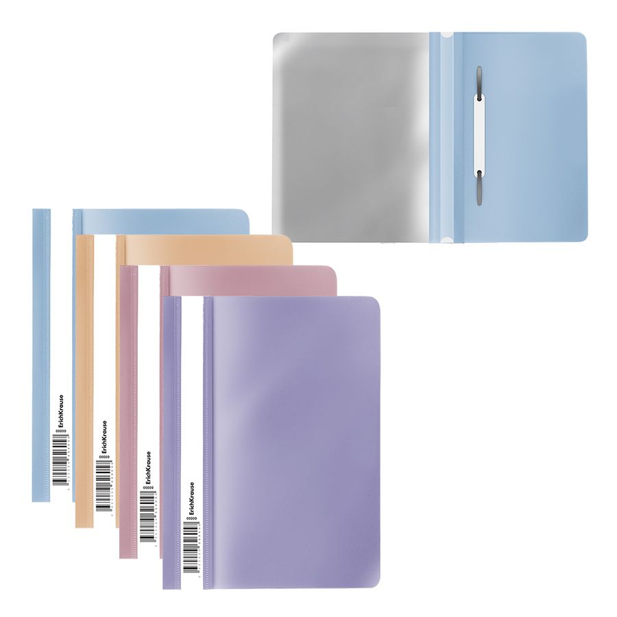 Папка-скоросшиватель формата А5+ из высококачественного пластика с текстурой поверхности "софт-тач", на которой не видно отпечатков пальцев и мелких царапин. Предназначена для быстрого сшивания, хранения и просмотра документов. Цвет папки – ассорти: бежевый, голубой, розовый, фиолетовый. Механизм - механический скоросшиватель; прозрачный верхний лист; усиленный пластиковый корешок с прозрачной полосой для информационной карточки. Размер - 230х170мм, толщина верхнего листа - 0.12мм, толщина нижнего листа - 0.18мм. Код и баркод на каждой единице товара.