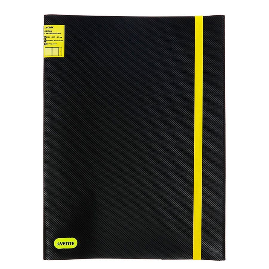 Папка с 040 вкладышами A3 "deVENTE. MonoChrome" A3 (320x435x25 мм) 500 мкм, с рельефной фактурной поверхностью, вкладыши 30 мкм, вертикальная неоновая желтая резинка 15 мм, индивидуальная упаковка и маркировка, непрозрачная черная с неновым желтым.