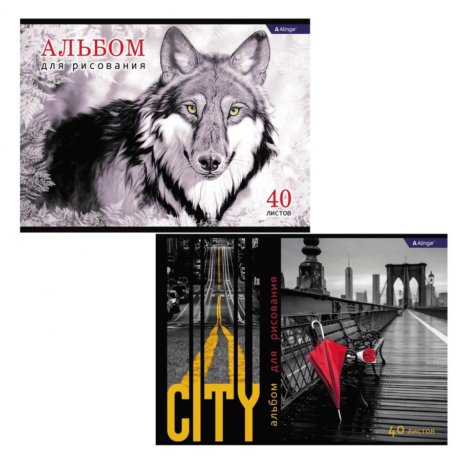 Альбом для рисования А4 40л., Alingar, на скрепке, мелованный картон (стандарт), 100 г/м2, "MIX. Волк. City."