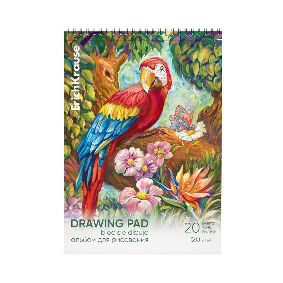 Альбом для рисования формата А4 (210х294 мм). Обложка из высококачественного мелованного картона плотностью 170 г/м2. Жесткая подложка 360 г/м2. В блоке 20 листов. Бумага плотностью 120 г/м2. Белизна бумаги - 100%. Микроперфорация для отрыва. Тип скрепления - спираль. Альбомы упакованы в термоусадочную пленку по 10 штук.