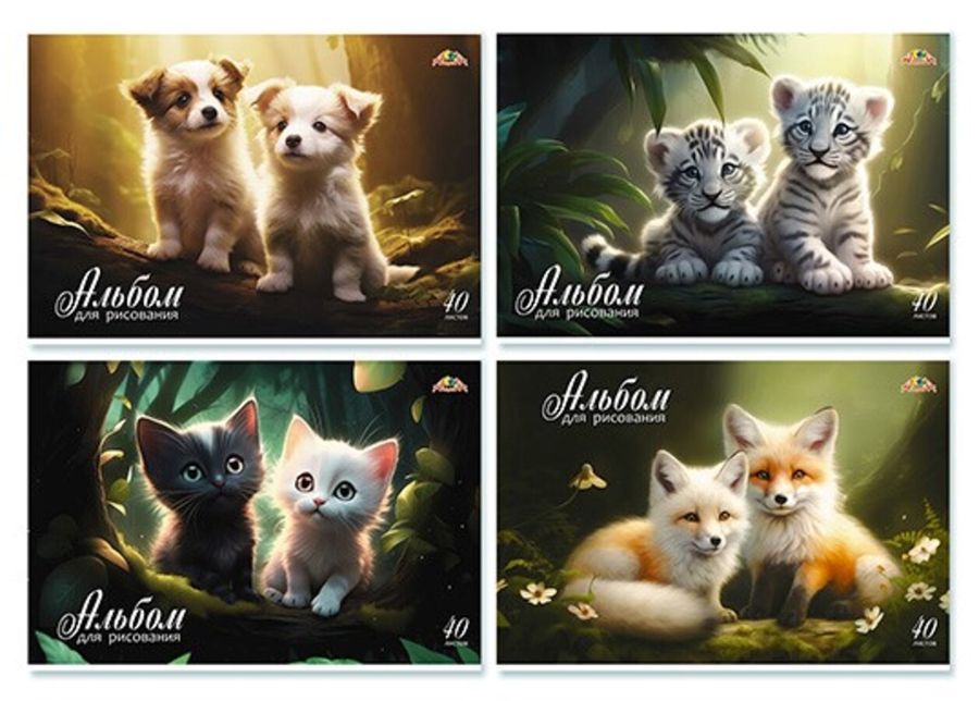 Альбомы по сериям. А4 формата, внутренний блок на 40 листов, плотностью 100 грм2. В каждой серии по 4 дизайна обложек. Обложка - мелованный картон, полноцветная печать с защитным ВД-лаком. Крепление - скоба.
