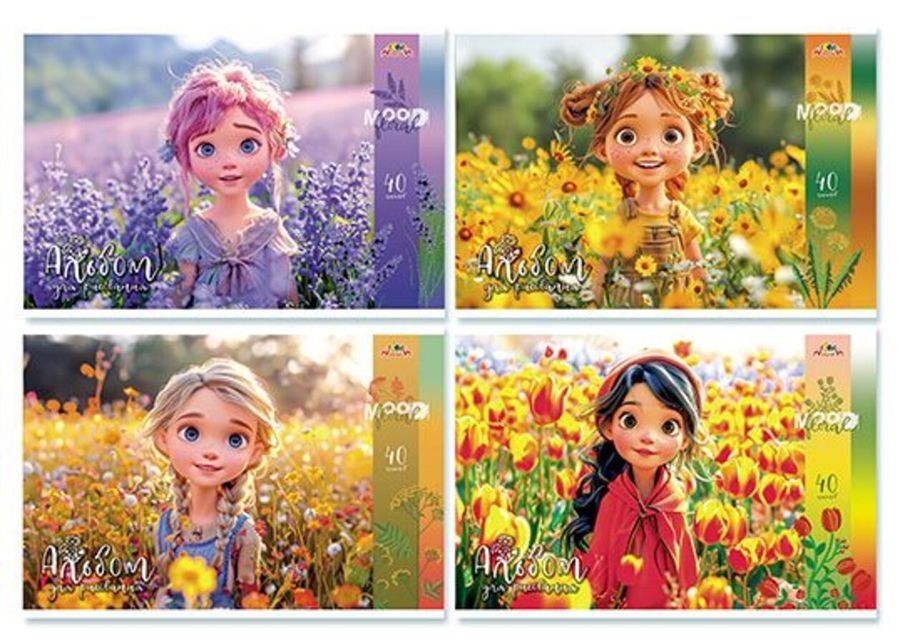Альбомы по сериям. А4 формата, внутренний блок на 40 листов, плотностью 100 грм2. В каждой серии по 4 дизайна обложек. Обложка - мелованный картон, полноцветная печать с защитным ВД-лаком. Крепление - скоба.