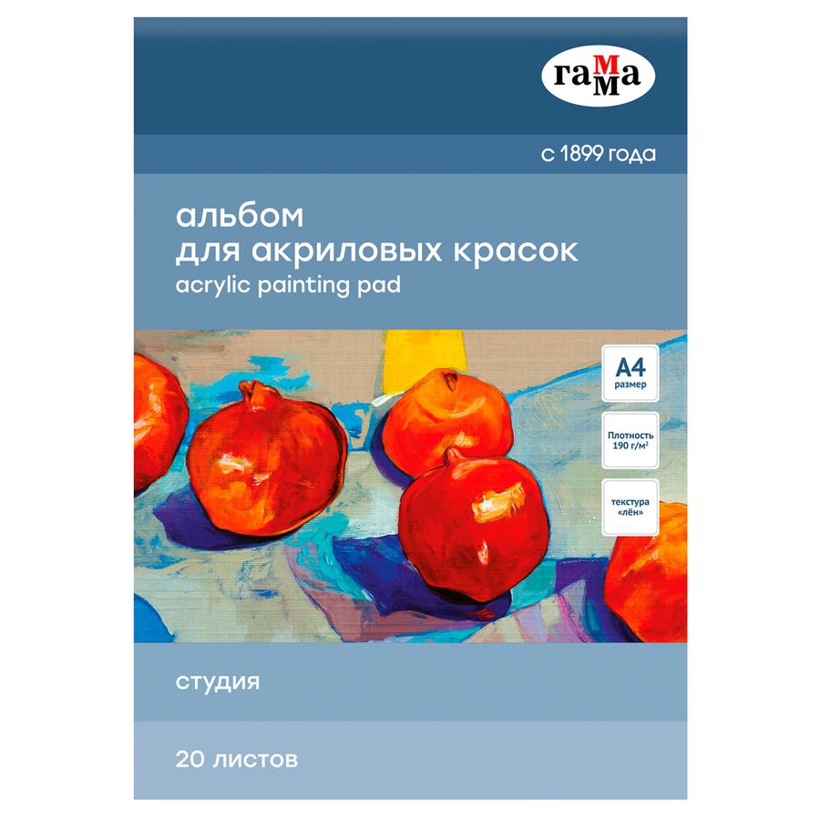 Альбом для акрила ГАММА серии «Студия» подходит для рисования водорастворимыми красками: акрилом, гуашью, темперой. Формат — А4. Внутри — 20 листов высококачественной бескислотной бумаги, состоящей на 100 % из целлюлозы. Плотность — 190 г/м2. Бумага обладает естественным белым цветом и текстурой «лён». Благодаря высокой степени адгезии она не требует дополнительной подготовки.Твёрдая подложка служит планшетом: в альбоме удобно рисовать на весу. Аккуратный отрыв обеспечивает склейка по короткому краю. • Формат: А4;• Количество листов: 20;• Техника: для акрила;• Внутренний блок: рисовальная бумага;• Плотность блока: 190 г/м2.