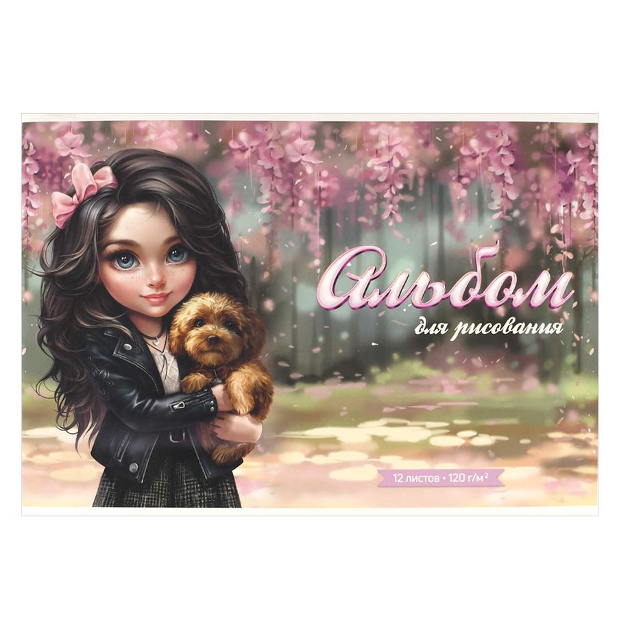 Альбом для рисования, БРЮНЕТКА С СОБАЧКОЙ. (формат А4). Количество листов: 12 листов. Внутренний блок - белый офсет 120 г/м². сплошной глянцевый УФ-лак. Вид крепления - мягкий переплёт (2 скобы). ВЕРНЫЕ ДРУЗЬЯ БРЮНЕТКА С СОБАЧКОЙ