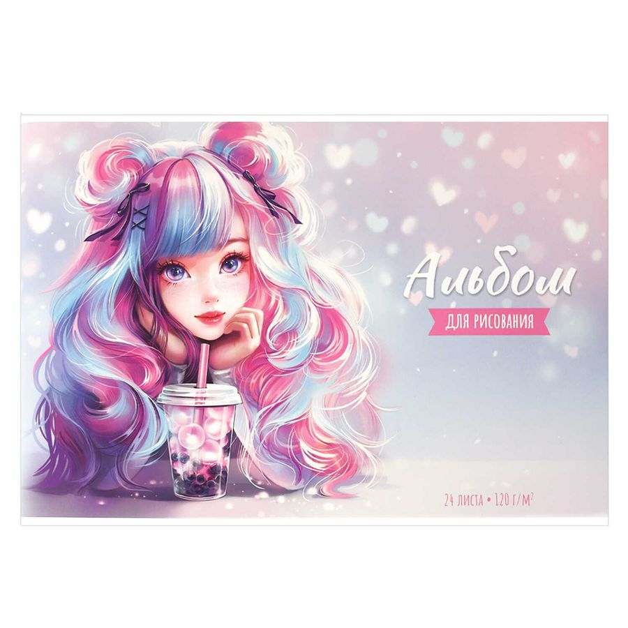 Альбом для рисования, ДЕВОЧКА С БАБЛ-ТИ. (формат А4). Количество листов: 24 листов. Внутренний блок - белый офсет 120 г/м². сплошной глянцевый УФ-лак. Вид крепления - мягкий переплёт (2 скобы). ОЧАРОВАТЕЛЬНЫЕ ДЕВОЧКИ ДЕВОЧКА С БАБЛ-ТИ