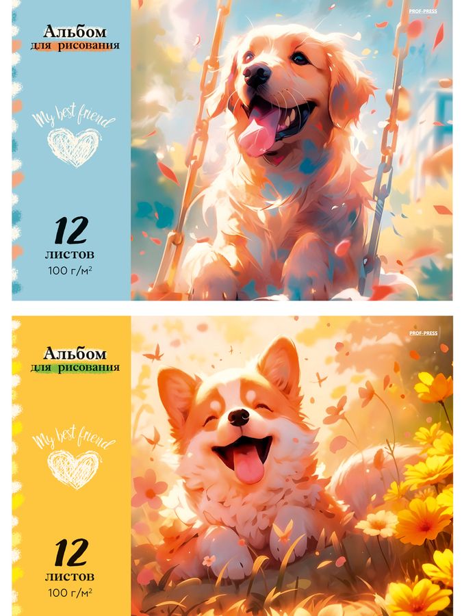 Альбом для рисования А4 12л скрепка Обаятельные песики-1 ассорти 2 диз. 100г/м2 PROF-PRESS 12-7992