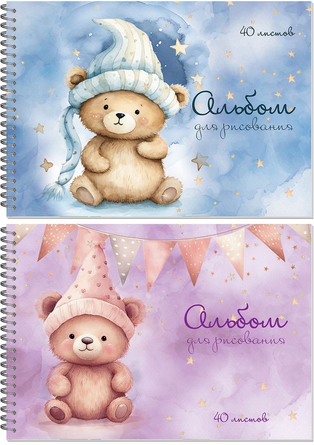 Альбом для рисования А4 40л гребень карт.обл. Мишки Teddy в шапочке ассорти 100г/м2 ПОЛИНОМ 25108 (жен)
