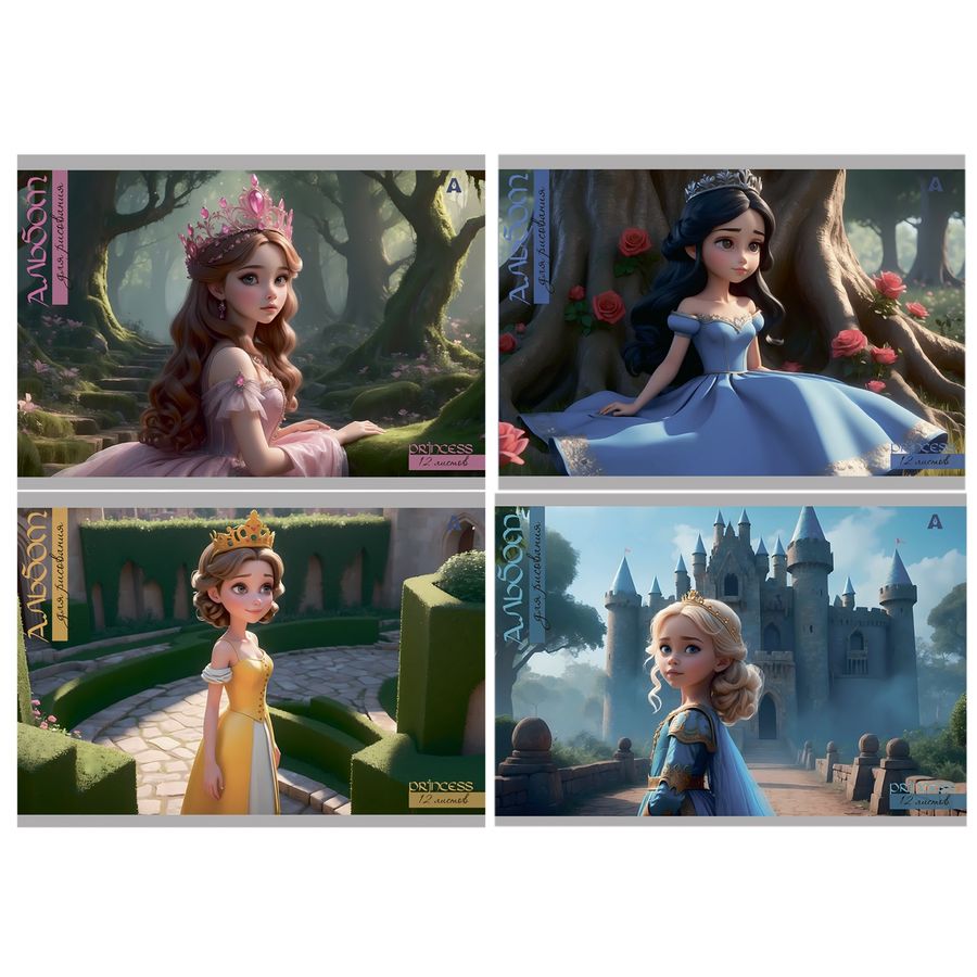 Альбом для рисования А4 12л., Alingar, на скрепке, мелованный картон (стандарт), 100 г/м2, "Принцесса у замка", 4 дизайна в пленке т/у