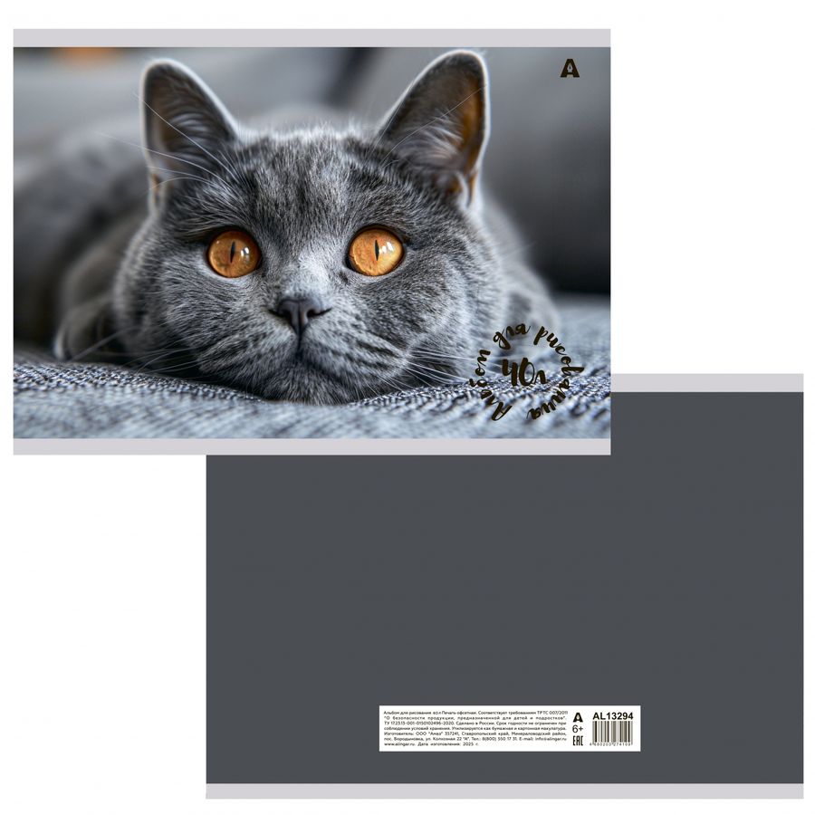 Альбом для рисования А4, 40л, Alingar, гребень, мелованный картон(стандарт) 210г/м2, офсет 100 г/м2,, "Котик"