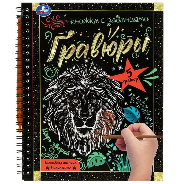 Книжка с заданиями «Царь зверей» из серии «Гравюры» ТМ «УМка» - отличный подарок для маленьких художников: - 5 гравюр - волшебная палочка в комплекте - удобный небольшой формат - в виде блокнота Данное издание представляет собой блокнот на пружинке с красивыми гравюрами. Если провести с помощью волшебной палочки по специальному стираемому слою, то на странице проявится рисунок, который можно заштриховать, заполнить его контур, провести отдельные линии. В итоге получится картинка с милыми цветными персонажами. Следуйте за своей фантазией и создавайте потрясающие шедевры! Игровые занятия с гравюрами ТМ «УМка» способствуют развитию: - мелкой моторики - сенсорного восприятия - мышления - творческих способностей - внимания Объём: 12 стр. Формат: 165 х 225 мм. Материал: картон + металл. Рекомендовано детям старшего дошкольного возраста.