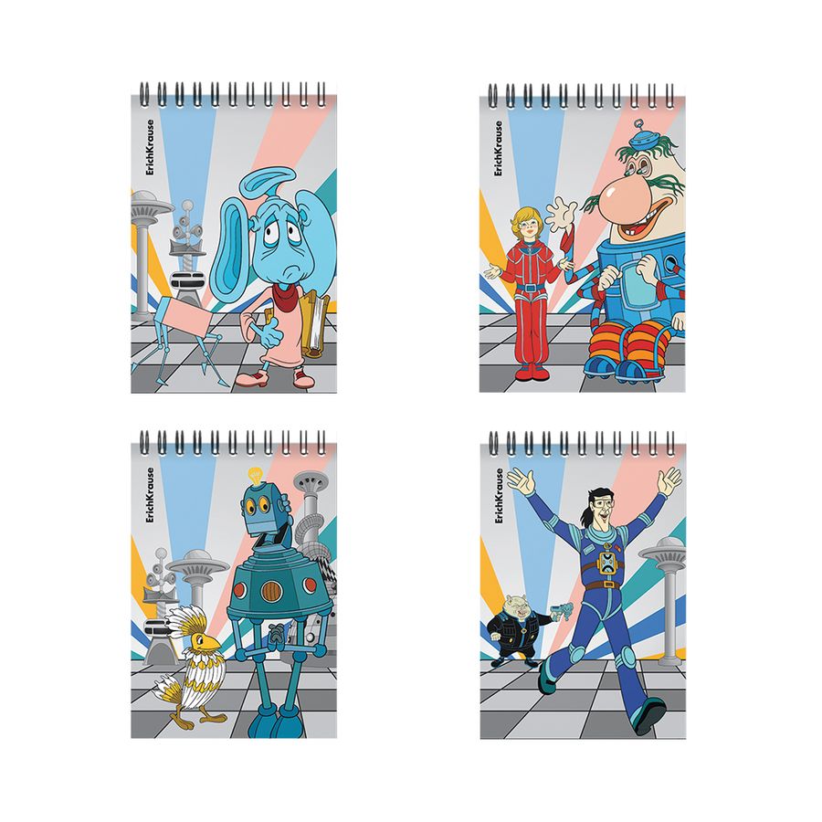 Блокнот формата А6 (100х146 мм). Обложка из высококачественного мелованного картона плотностью 170 г/м2. Плотная подложка 340 г/м2. В блоке 80 листов в клетку. Бумага офсетная плотностью 60 г/м2. Цвет линовки - синий. Тип скрепления - спираль.