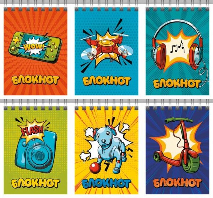 Блокнот А7, 40л, арт.410011/16 ГАДЖЕТЫ, клетка, евроспираль по короткой стороне, выбор.ТВИН-лак, ассорти 6 дизайнов. Обложка - мелованный картон плотность 200г/м2, блок - бумага офсет 65г/м2