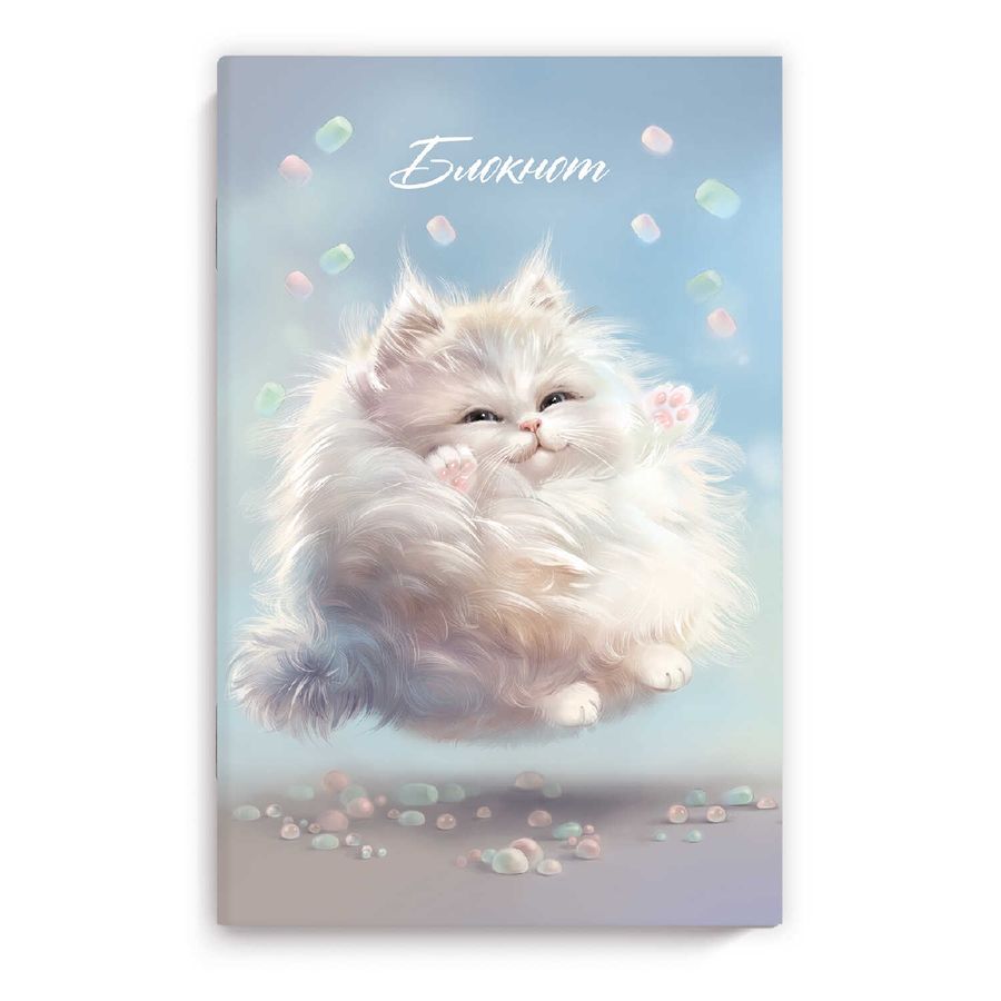 Блокнот, 120х185 мм, 40 л, арт. 67880 ПУШИСТЫЙ КОТ / Блок - белый офсет 65 г/м², точка, мягкий переплёт (2 скобы), пленка софт тач вельвет.