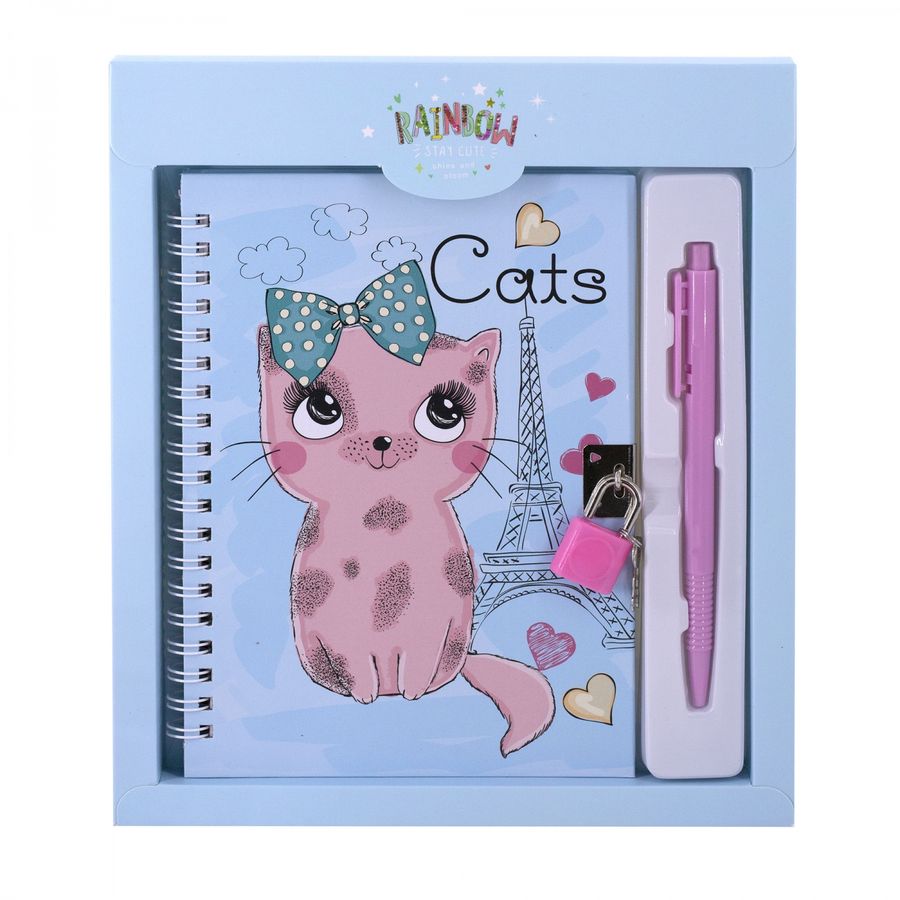 Набор Блокнот с замком 195х230мм 45л клетка тв.обл. + Ручка Милая киска голубой ALINGAR AL11287