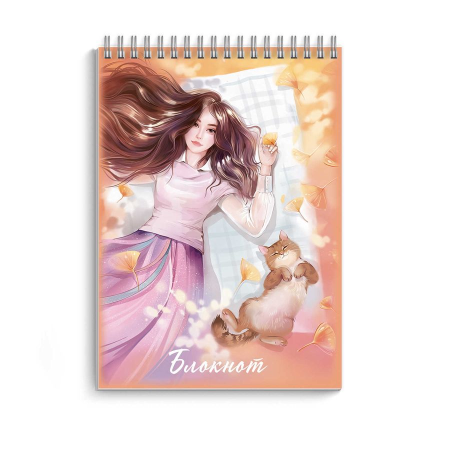Блокнот, А7, 40 л, арт. 68167 ДЕВУШКА С КОТИКОМ / Блок - белый офсет 65 г/м², клетка, гребень по короткой стороне, УФ-лак сплошной,