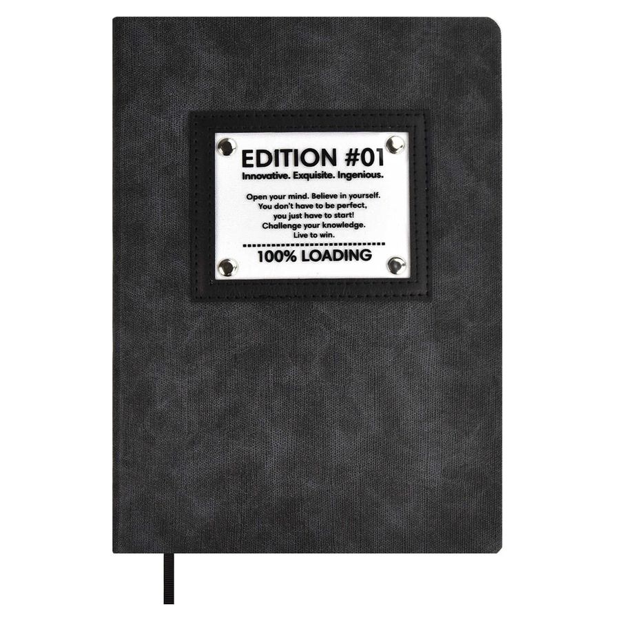 Записная книжка ESCALADA, А5+, 96 л., арт. 67694/ 15 КАНВАС ЭКСТРА ЧЁРНЫЙ (кожзам: 175х245 мм, твёрдый переплёт, материал обложки: искусственная кожа "Канвас экстра"; способ крепления блока: ниткошвейный; декор: аппликация из искусственной кожи, аппликация из ПВХ, металлические клёпки, шелкография в одну краску; вн. блок: 96 л., белый офсет 70 г/м², печать в одну краску (клетка), справочный материал: нет; перфорация углов блока: нет; закладка/-и: одно ляссе, каптал: есть; форзац: печать пантоном, персонализация возможна: да; индивидуальная упаковка: ПЭТ-пакет)