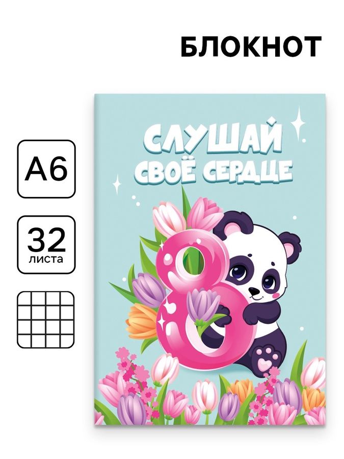 Блокнот А6 32л клетка скрепка Панда 8 Марта ArtFox 10708589