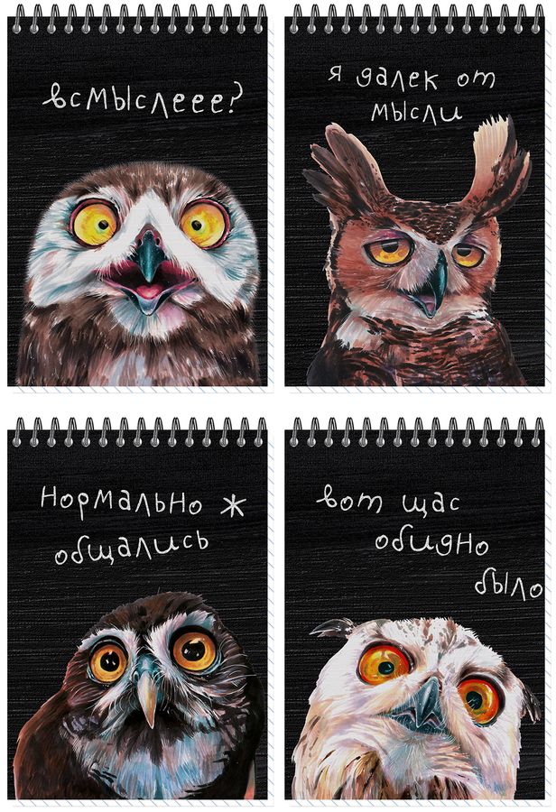 Блокнот А6 60л без линовки гребень Совы ассорти 4 диз. ПОЛИНОМ 3342