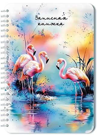 Записная книжка на гребне, 40 листов, формат А5 (размер 128мм*190мм). Обложка - мелованный картон, полноцветная печать. Внутренний блок: Клетка, офсет 60гр, Крепление - Евроспираль сбоку, по длинной стороне.