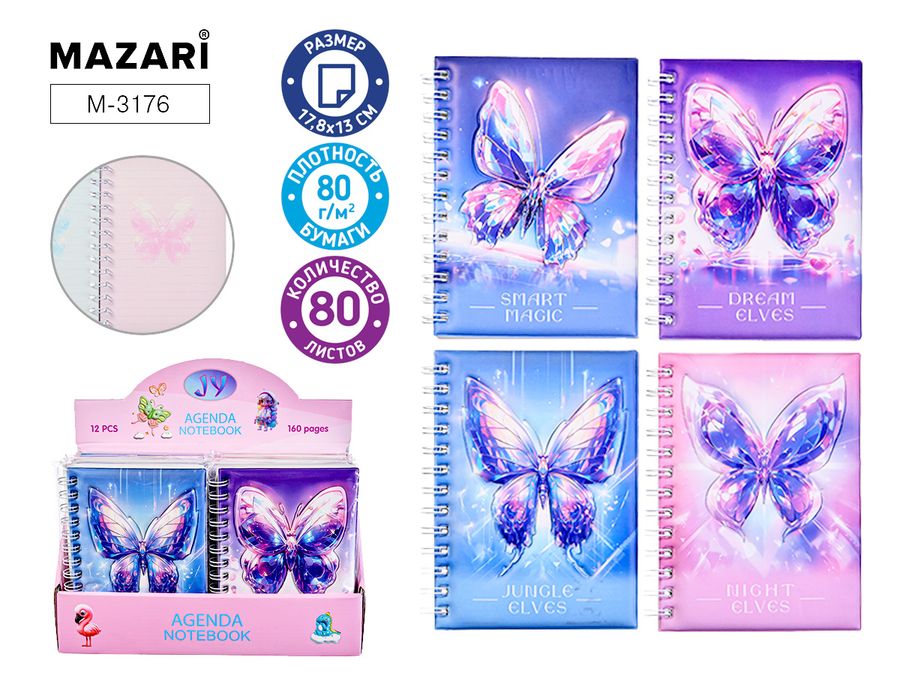 Блокнот 130х180мм 80л линия гребень тв.обл. Нео бабочка ассорти 4 дизайна MAZARI M-3176