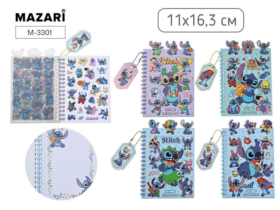Блокнот А6 16л клетка гребень мягк.обл. Ушастик + наклейки 8л ассорти 4 диз. MAZARI M-3301