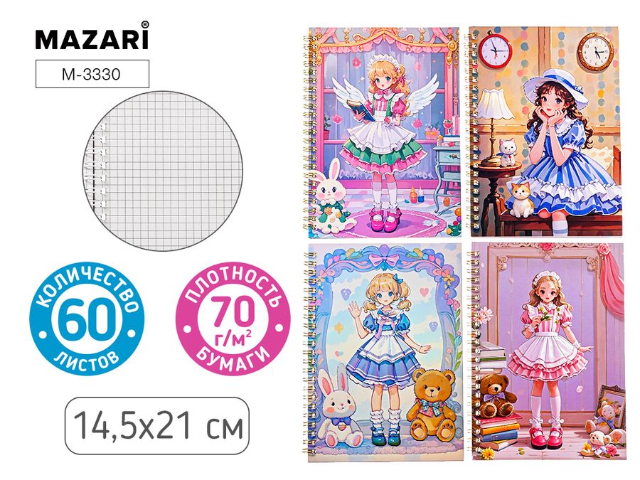 Блокнот А5 60л клетка гребень мягк.обл. Девочки ассорти 4 дизайна MAZARI M-3330