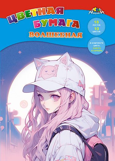 Цветная бумага волшебная, 18 листов, 10 цветов, формат А4, плотность 50 гр/м2. Внутренний блок - офсет №2, двойной прокрас с одной стороны. В наборе цвета: красный, желтый, синий, черный, розовый, оранжевый, зеленый, коричневый и 2 листа мелованной бумаги: золотой и серебряный. Крепление - скоба, обложка - офсетная бумага. Рекомендуется детям от 3 лет.