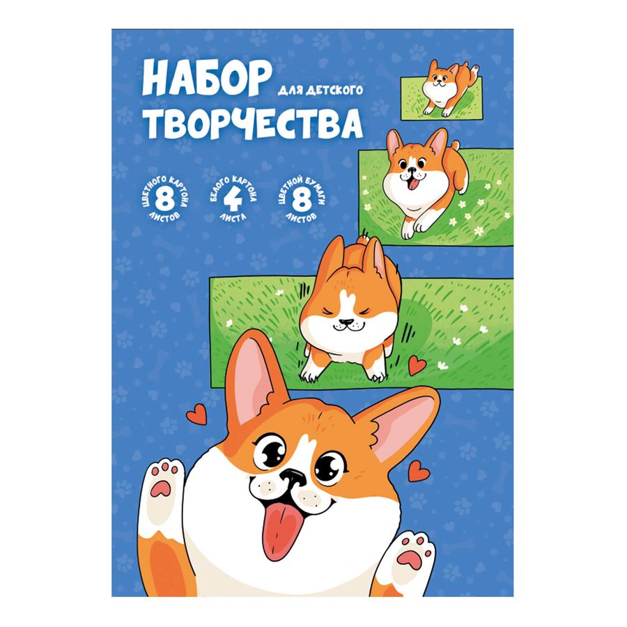 Набор для детского творчества. КОРГИ. Формат А4. Количество листов - 20. Комплектность: белый картон (4 л.), цветная бумага (8 л.), цветной картон (8 л.). Тип обложки: папка с клапанами. Материал обложки: мелованный картон с серым оборотом 230 г/м². Печать обложки: полноцветная печать. Индивидуальная упаковка: нет.