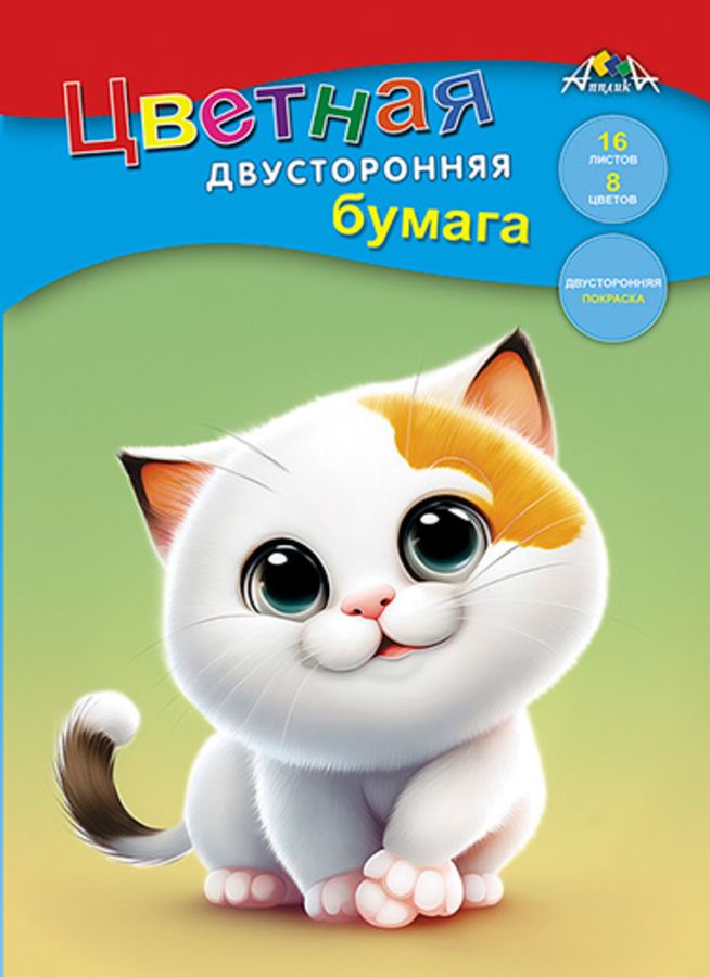 Цветная двусторонняя бумага, 16 листов, 8 цветов, формат А4, плотность 50 гр/м2. Внутренний блок - офсет №2, двойной прокрас с двух сторон. В наборе цвета: красный, желтый, синий, черный, фиолетовый, оранжевый, зеленый, коричневый. Крепление - скоба, обложка - офсетная бумага. Рекомендуется детям от 3 лет.