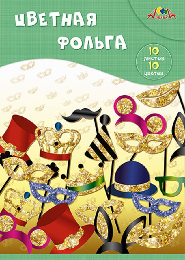 Цветная радужная фольга, 10 листов, 10 цветов, формат А4, плотность 120 гр/м2. Внутренний блок - металлизированная пленка разных цветов на бумажной основе. В наборе цвета: зеленый, синий, золотой, фиолетовый, желтый, красный, голубой, малиновый, оранжевый, серебряный. Упаковка - папка из мелованного картона с двумя клапанами. Рекомендуется детям от 3 лет.