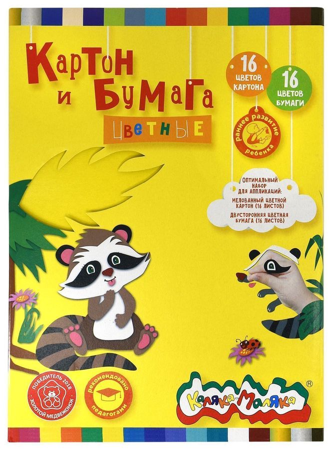 В линейке материалов для аппликаций Каляка-Маляка® появился набор с мелованным картоном и двусторонней бумагой формата А4. Новинка является расширенной версией НКБКМ8/8, теперь в палитре 16 цветов бумаги и 16 цветов картона. Окрас яркий, равномерный, без полос. Листы гибкие, легко приклеиваются. Набор предназначен для поделок, аппликаций и рисования, удобен для занятий творчеством в садике и дома, рекомендован детям с 3-х лет. Картон представлен следующими цветами: красный, оранжевый, желтый, зеленый, синий, коричневый, черный, розовый, золотой, серебряный, синий, телесный, сиреневый, салатовый, серый, цвет морской волны. Бумага представлена следующими цветами (по 2 листа каждого цвета в наборе): Лицо: красный, желтый, зеленый, голубой, фиолетовый, коричневый, розовый, черный. Оборот: малиново-розовый, оранжевый, салатовый, синий, цвет морской волны, телесный, светло желтый, серый.
