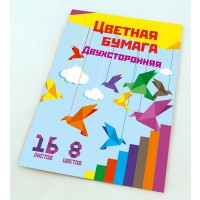 Цветная бумага, 32 листа, 16 цветов, формат А4, плотность 50 гр/м2. Внутренний блок - офсет №2, двойной прокрас с одной стороны. В наборе цвета: светло-розовый, розовый, красный, оранжевый, желтый, салатовый, зеленый, темно-зеленый, бирюзовый, голубой, синий, фиолетовый, светло-коричневый, темно-коричневый, оливковый, черный. Крепление - скоба, обложка - офсетная бумага. Рекомендуется детям от 3 лет.