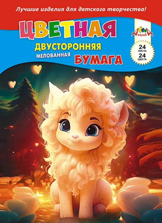 Бумага цветная А4 24л 24цв мелованная двусторонняя Малышка скрепка АППЛИКА С9598-33
