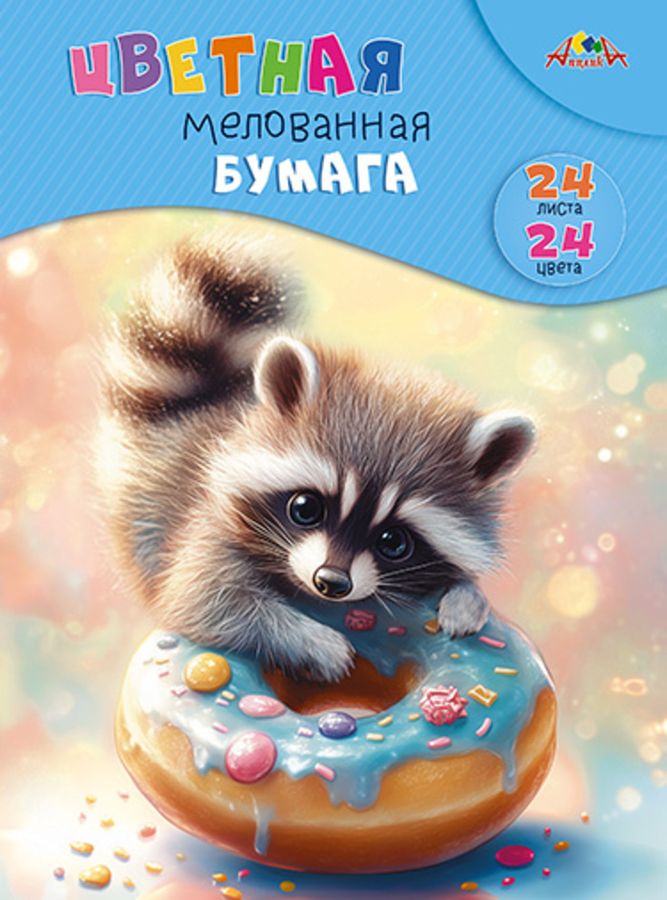 Бумага цветная А4 24л 24цв мелованная Зверек с пончиком скрепка 60г/м2 АППЛИКА С1233-17