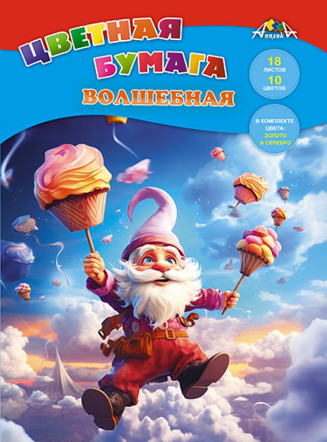 Бумага цветная А4 18л 10цв волшебная + золотой серебряный Веселый гномик скрепка АППЛИКА С0192-32