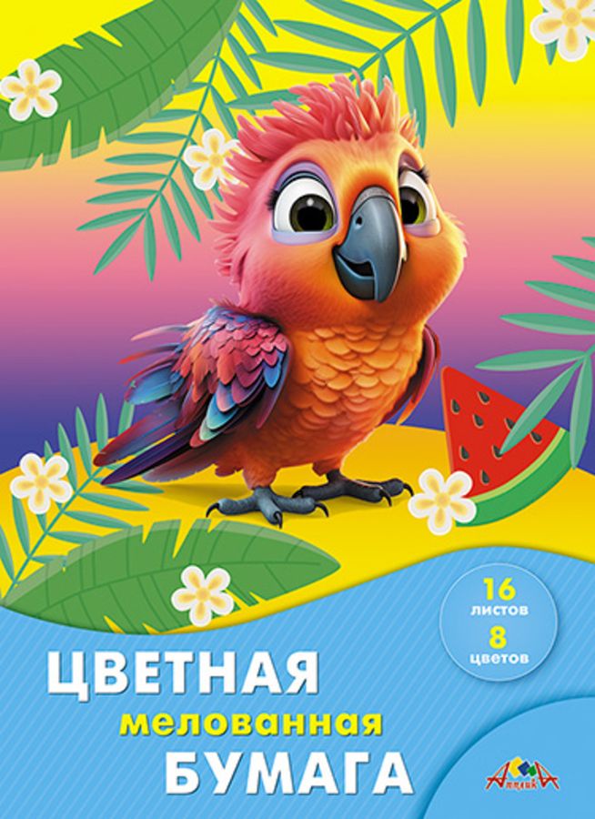 Цветная мелованная бумага, 16 листов, 8 цветов, формат А4, плотность 60 гр/м2. Внутренний блок - мелованная бумага двойного прокраса, что дает насыщенность цвета. В наборе цвета: красный, желтый, синий, черный, оранжевый, фиолетовый, зеленый, коричневый. Крепление - скоба, обложка - мелованный картон. Рекомендуется детям от 3 лет.