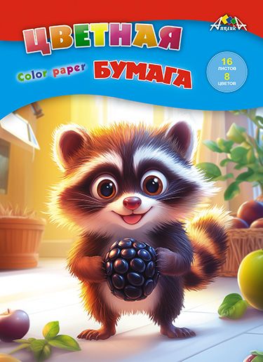Бумага цветная А4 16л 8цв газетная Енотик скрепка 50г/м2 АППЛИКА С0005-75