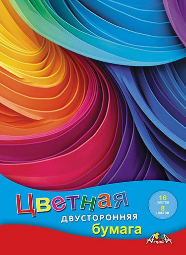 Цветная двусторонняя бумага, 16 листов, 8 цветов, формат А4, плотность 50 гр/м2. Внутренний блок - офсет №2, двойной прокрас с двух сторон. В наборе цвета: красный, желтый, синий, черный, фиолетовый, оранжевый, зеленый, коричневый. Крепление - скоба, обложка - офсетная бумага. Рекомендуется детям от 3 лет.