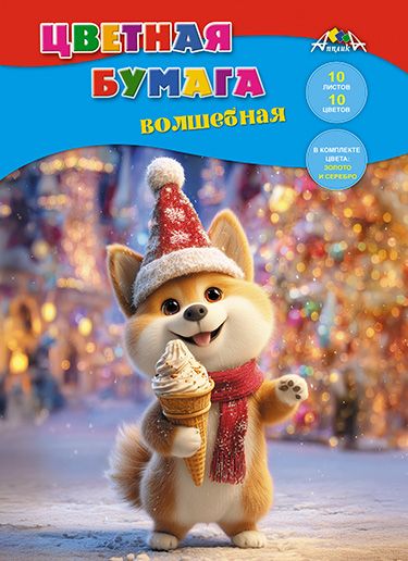 Цветная бумага волшебная, 10 листов, 10 цветов, формат А4, плотность 50 гр/м2. Внутренний блок - офсет №2, двойной прокрас с одной стороны. В наборе цвета: красный, желтый, синий, черный, фиолетовый, оранжевый, зеленый, коричневый и 2 листа мелованной бумаги: золотой и серебряный. Крепление - скоба, обложка - офсетная бумага. Рекомендуется детям от 3 лет.