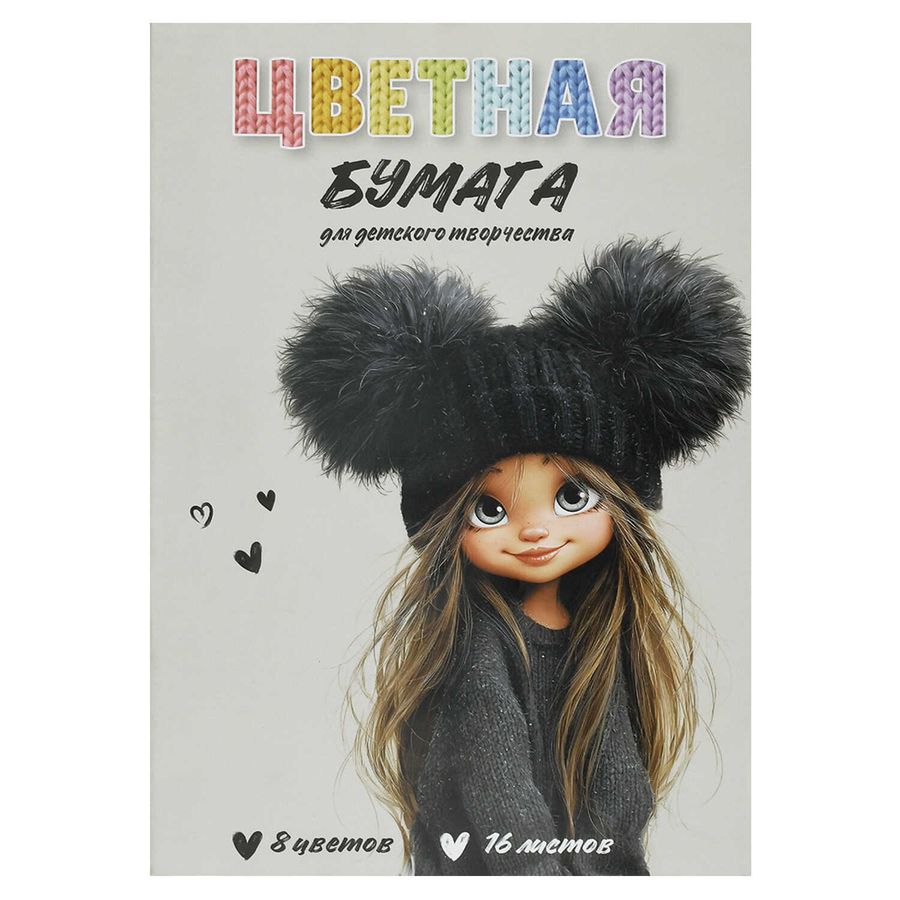 Цветная бумага арт. 73165 ДЕВЧОНКА В ШАПКЕ /200x275 мм, мягкий переплёт (2 скобы), 16 л, обложка - полноцветная печать, мелованная бумага 130 г/м², блок - газетная бумага, 45 г/м², 8 цветов, двусторонняя печать /