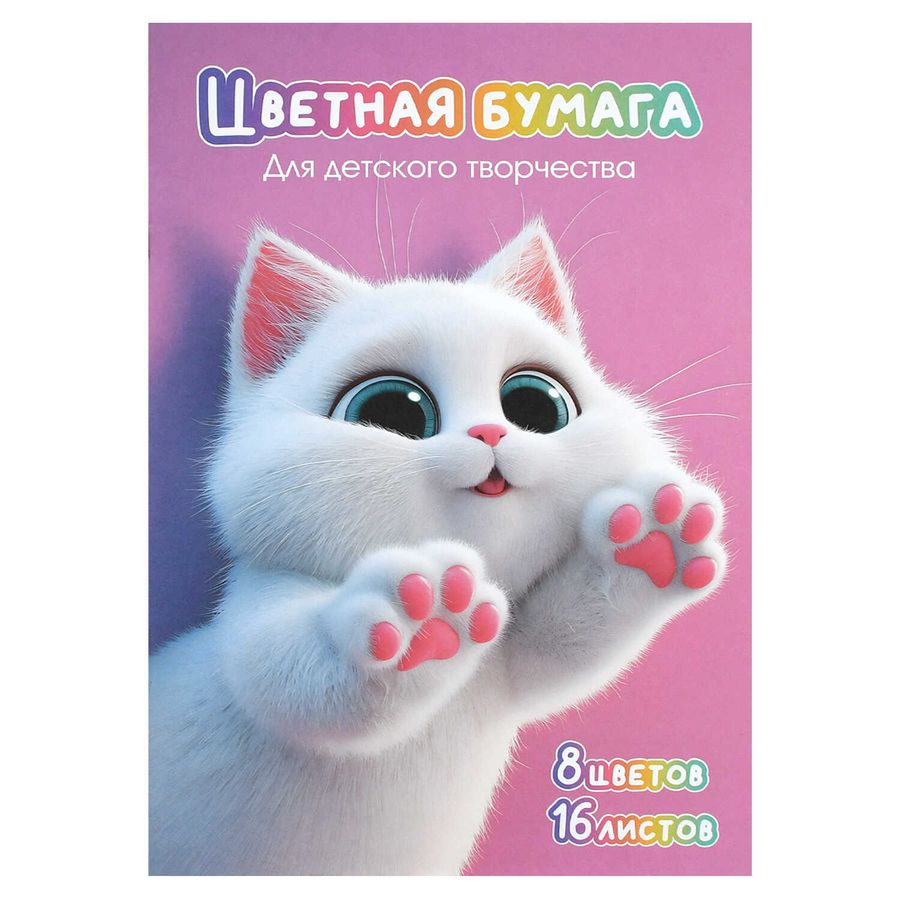 Цветная бумага арт. 73177 ПУШИСТЫЕ ЛАПКИ /195х290 мм, мягкий переплёт (2 скобы), 16 л, обложка - полноцветная печать, офсетная бумага 120 г/м², блок - газетная бумага, 45 г/м², 8 цветов, двусторонняя печать /