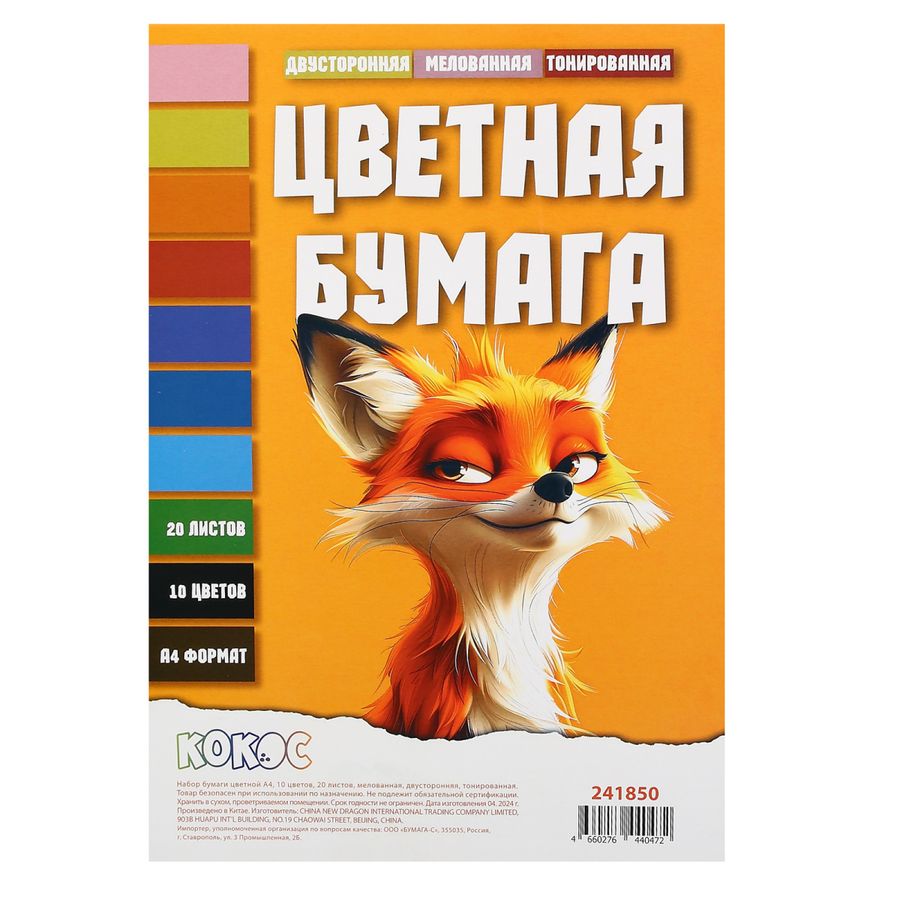 Набор цветной бумаги, А4, 20 листов, 10 цветов, мелованная, двусторонняя, тонированная, склейка, КОКОС, 241850