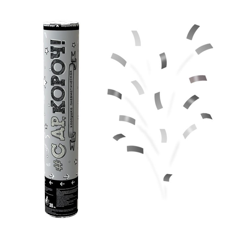 Пневмохлопушка "С ДР короч" фольга/бумага украсит день рождения и детский праздник. Фонтан из разноцветных конфетти высотой 7-8 метров поможет придать празднику сказочную атмосферу. Хлопушка приводится в действие сжатым воздухом. Баллончик со сжатым воздухом – металлический, что гарантирует целостность приводного механизма до момента запуска. Возможно использование в помещении, если позволяет площадь. Наполнитель – серебряные фольгированные, белые и черные бумажные стримеры.. Высота выстрела хлопушек 7-8 метров. Количество наполнителя хлопушки зависит от высоты хлопушки, т.е. чем выше хлопушка, тем больше наполнителя она содержит, тем ярче и объемнее получается фонтан конфетти.