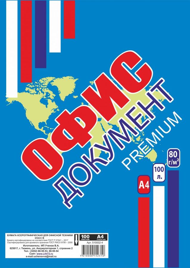 Бумага для ксерокса А4 100л Офис документ Премиум 80г/м2 LICHT 510002-4