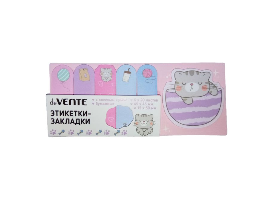 Набор самоклеящихся этикеток-закладок "deVENTE. Grey cat" бумажные 45x45 мм и 15x50 мм, 6x20 листов, офсет 80 г/м², печать 4+0, ассорти форм, 6 дизайн