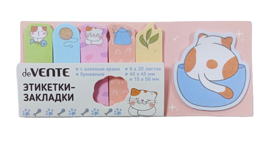 Набор самоклеящихся этикеток-закладок "deVENTE. Lazy cat" бумажные 45x45 мм и 15x50 мм, 6x20 листов, офсет 80 г/м², печать 4+0, ассорти форм, 6 дизайнов, в пластиковом пакете с европодвесом