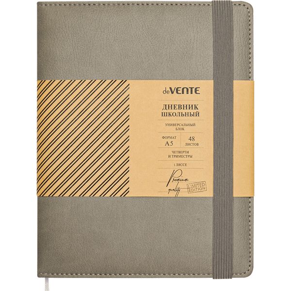 Дневник "deVENTE. Grey" универсальный блок, офсет 1 краска, кремовая бумага 80 г/м², твердая обложка из искусственной кожи с поролоном, вертикальная резинка, отстрочка, 1 ляссе