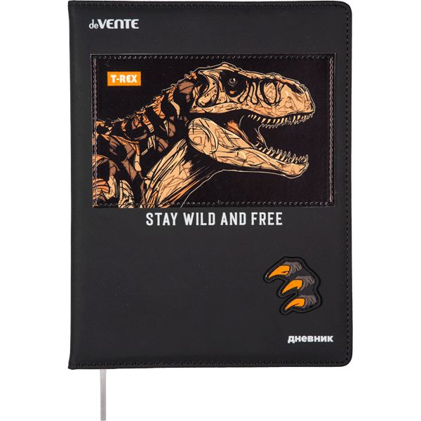 Дневник "deVENTE. T-Rex" универсальный блок, 48 листов, белая бумага 80 г/м², печать в 1 краску, твердая обложка из искусственной кожи с поролоном, аппликация из искусственной кожи, цветная печать, цветная объемная аппликация rubber patch, шелкография, отстрочка, 1 ляссе.
