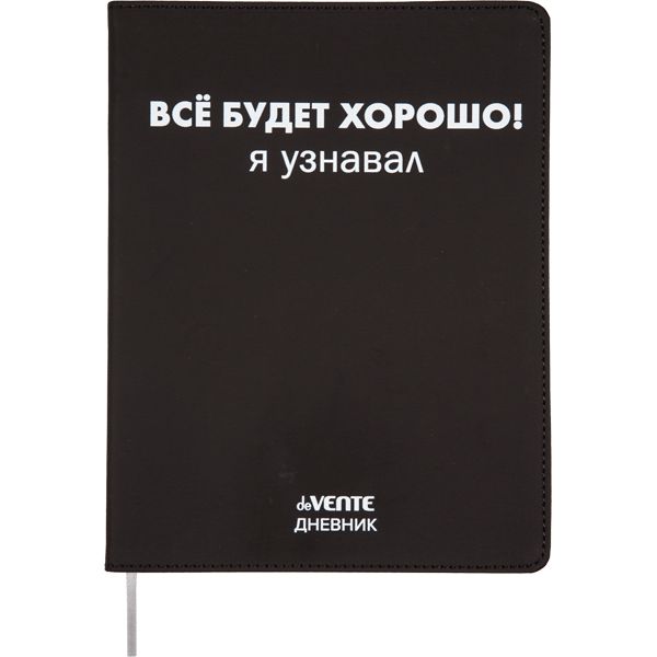 Дневник "deVENTE. Всё будет хорошо! Я узнавал." универсальный блок, 48 листов, белая бумага 80 г/м², печать в 1 краску, гибкая обложка из искусственной кожи, шелкография, отстрочка, 1 ляссе.